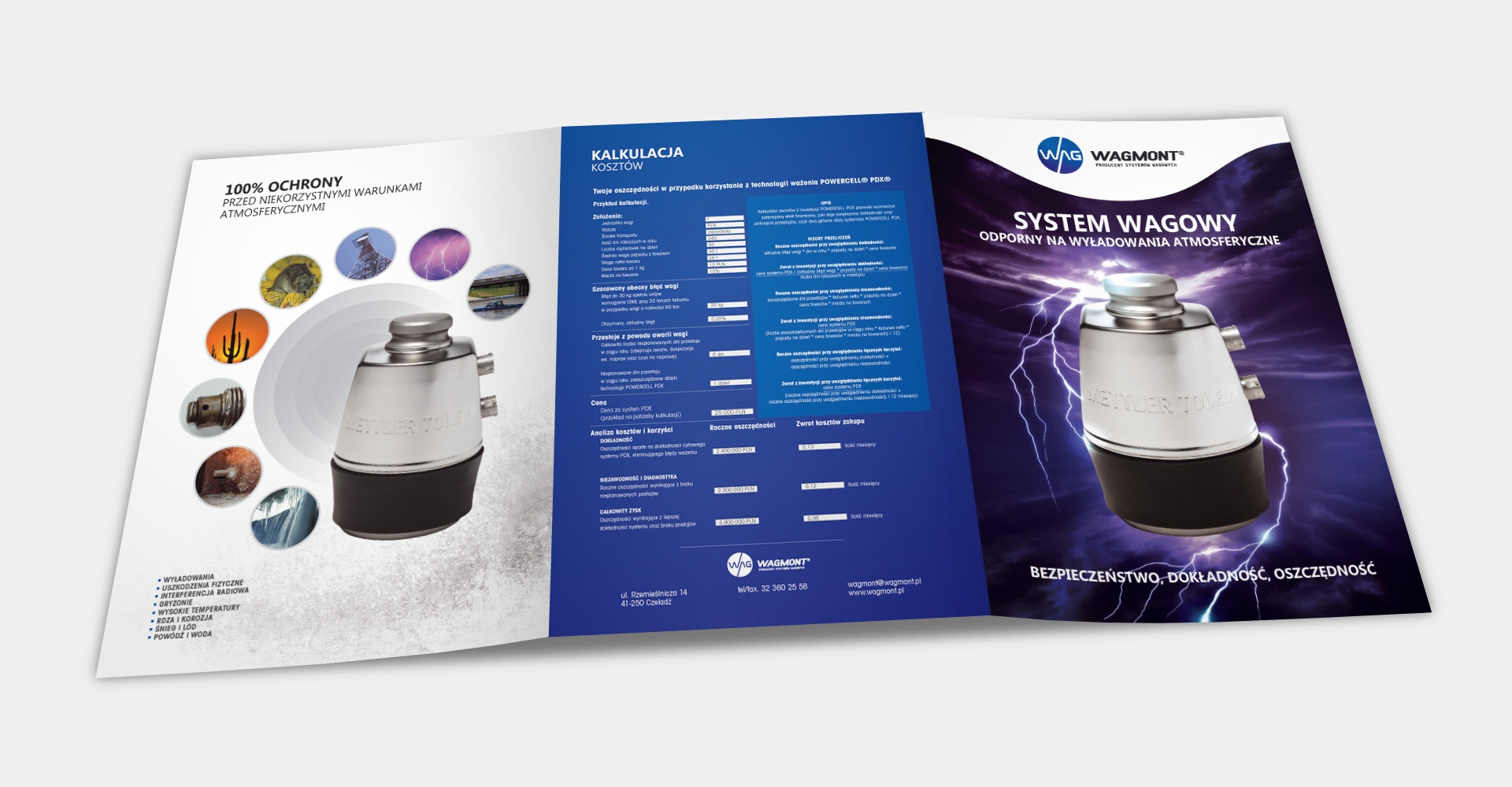 Projekt folderu tryptyk A4 dla producenta systemów wagowych, Czeladź