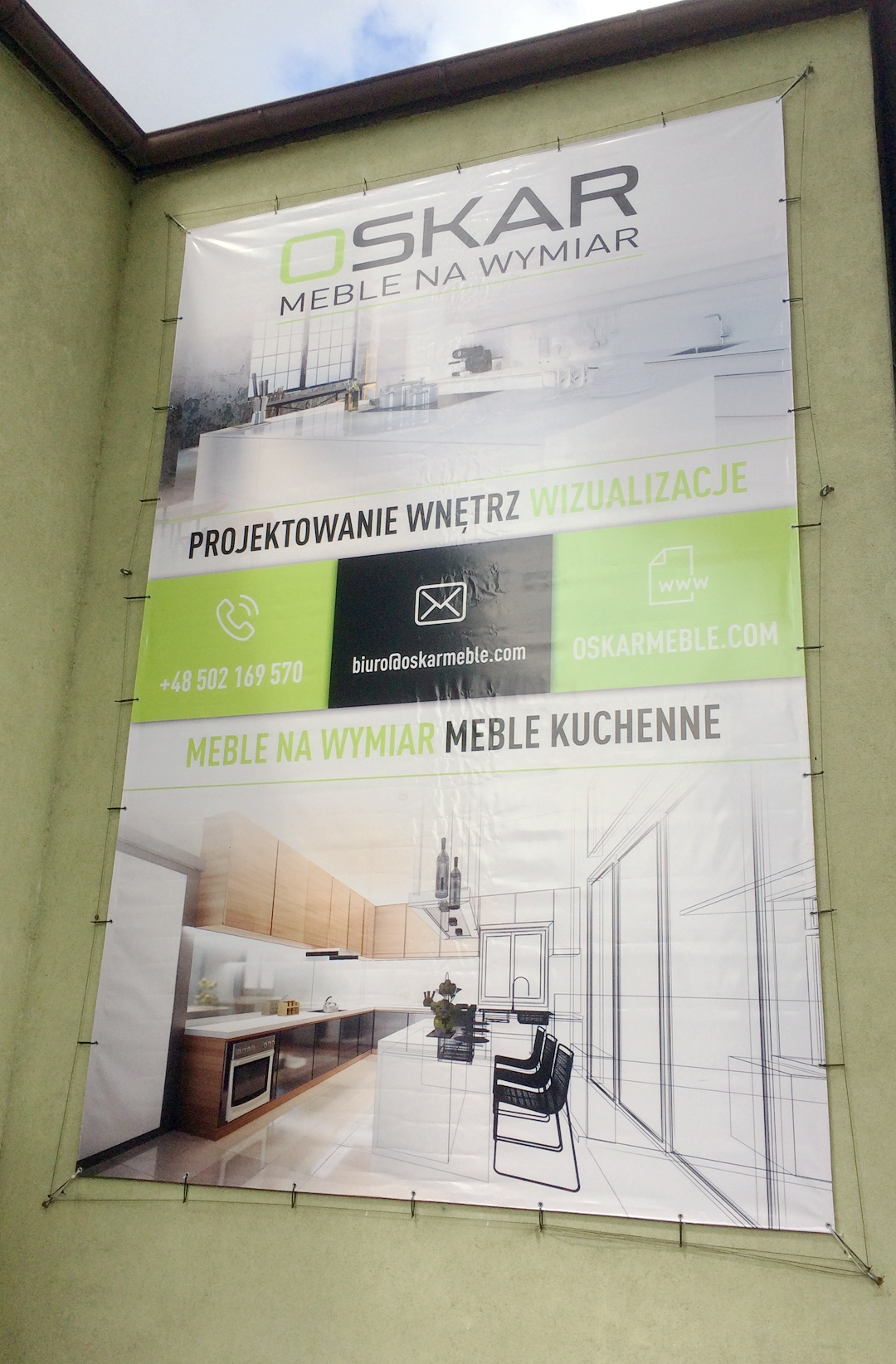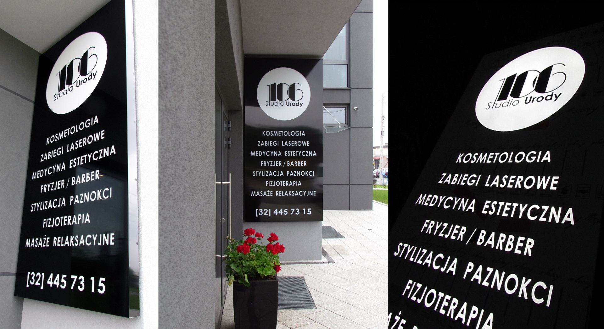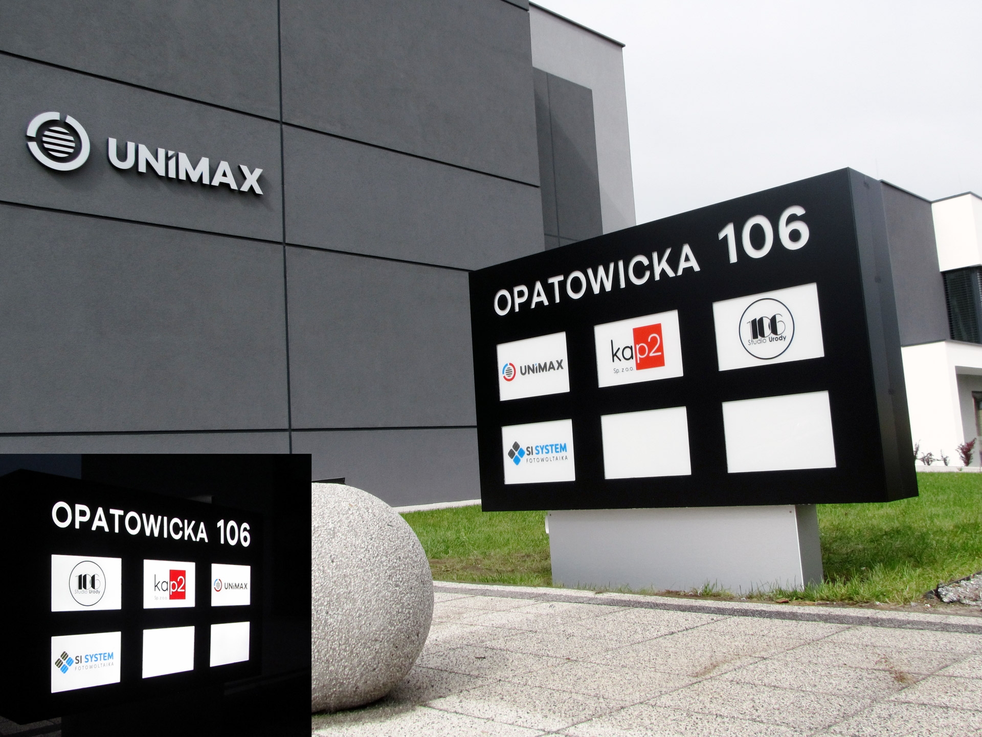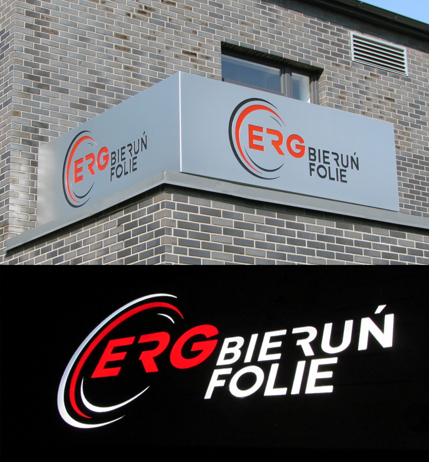 Kompleksowa reklama zewnętrzna: napis 3D z frezowanego dibondu, oklejenie witryny folią ploterową i drukowaną, Kaseton świetlny LED z giętego dibondu na konstrukcji stalowej,