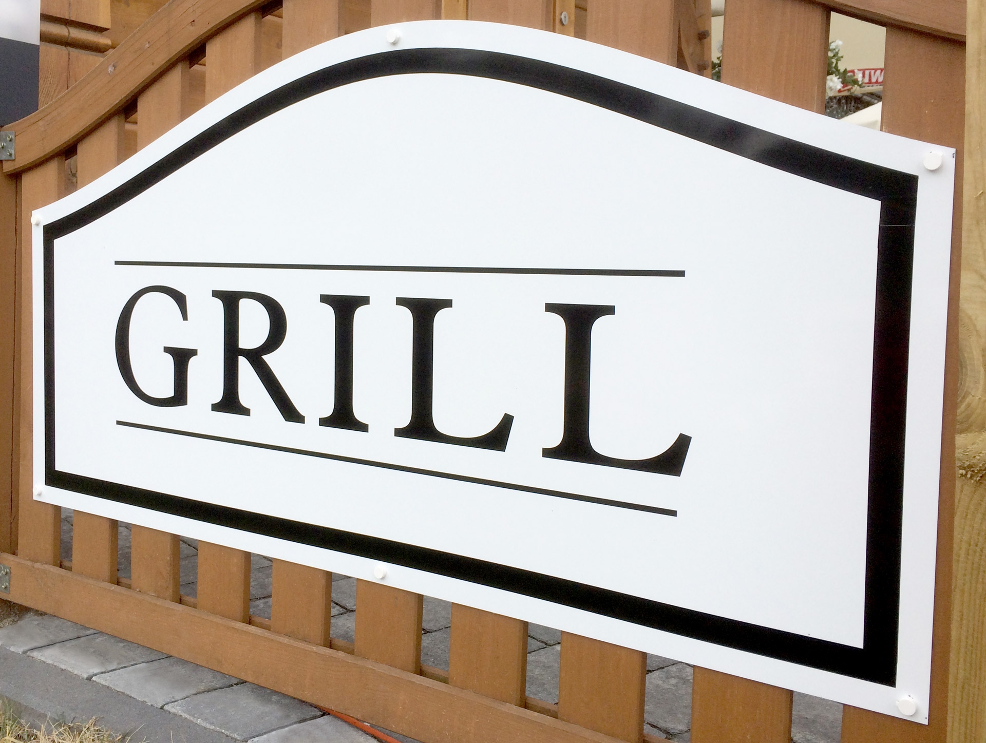 Narożny kaseton świetlny LED 2,8x1m z konstrukcją stalową. Efekt świecenia samej grafiki koloru czerwonego i czarnego w dzień i białego w nocy (plexi day/night)