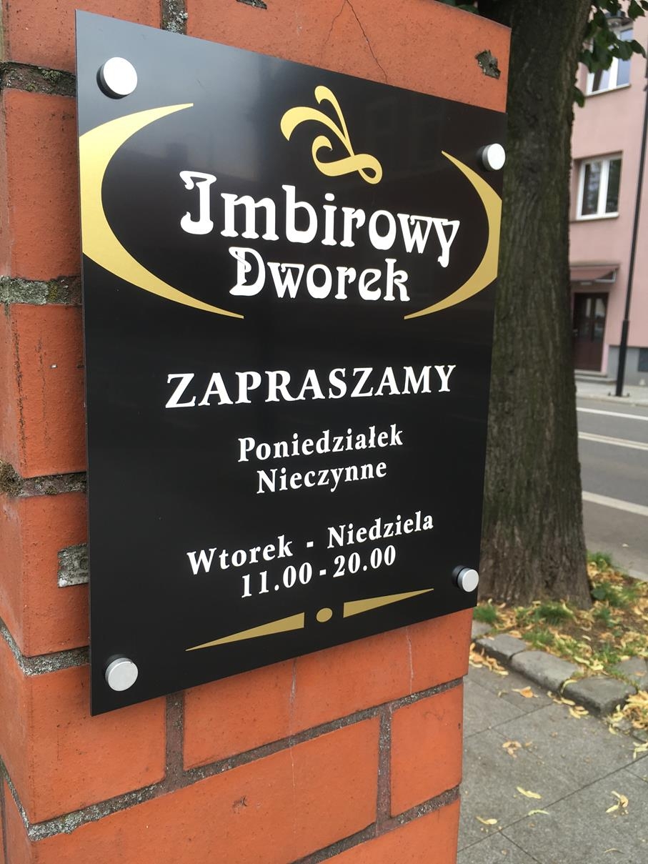 Imbirowy Dworek RESTAURACJA - tabliczka z godzinami otwarcia na dystansach
