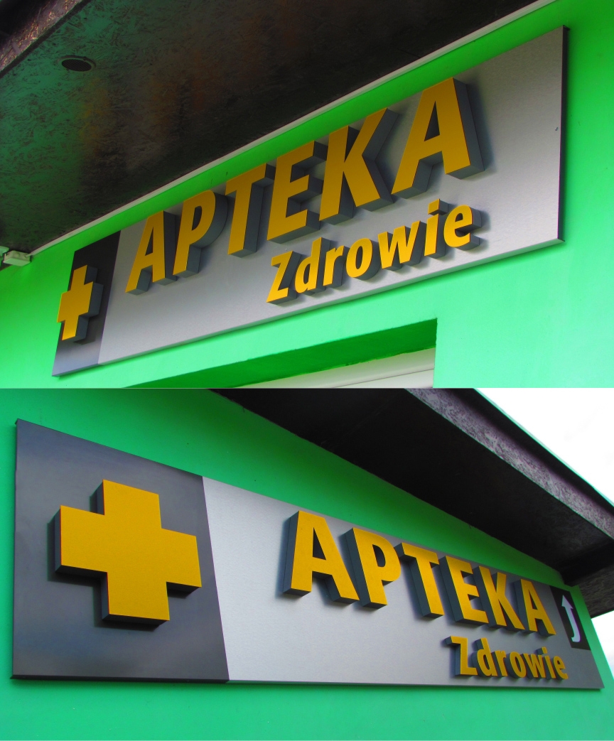 Litery blokowe ze styrodruru na podkładzie z dibondu dla apteki