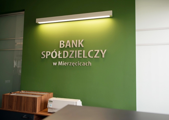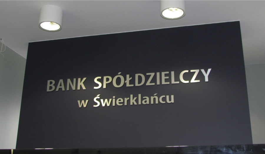 Litery przestrzenne 3D z dibondu dla banku we wnętrzu (produkcja i montaż)
